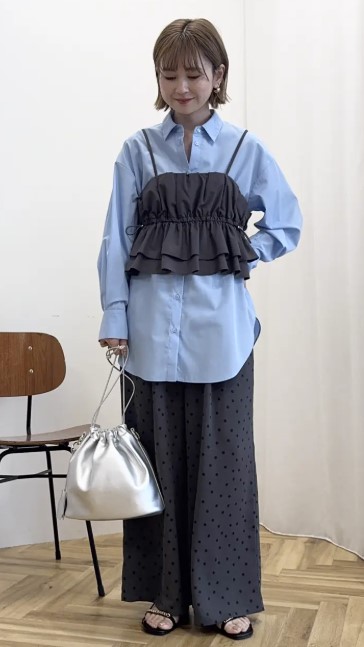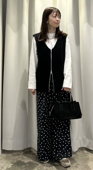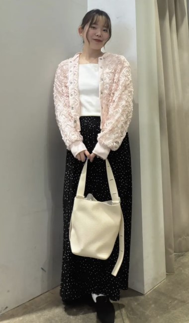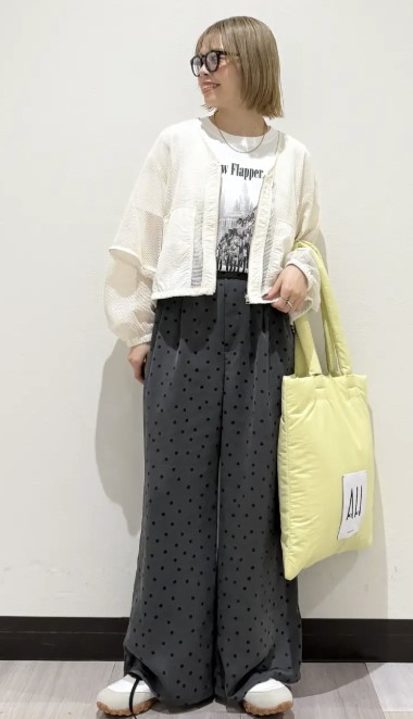細やかなドット柄が上品なアクセントとなり、シンプルなコーデを華やかな印象に♪