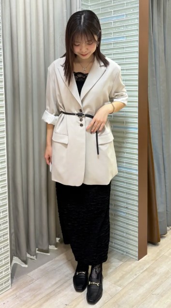 前を留めても開けてもバランスよく決まり、インナー次第で表情が変わるのも魅力♪